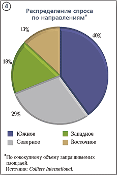 в основном крупные логистические операторы. Высокий спрос сохраняется и на площади среднего масштаба (от 5 до 10 тыс. м2) – он составляет 28%. Спрос на площади 3...5 тыс. м2 и 1...3 тыс. м2 составляет соответственно 23 и 13% (диаграмма 3). Наибольшей популярностью продолжают пользоваться южное (40% общего объема спроса) и северное (29%) направления (диаграмма 4). Спрос на восточное и западное направления составляет 13 и 18% соответственно. Высокий спрос и на складские комплексы, расположенные в 15...30 км и 30...45 км от МКАД. Спрос на них составляет соответственно 49 и 43%. В 4% случаев потенциальные арендаторы готовы разместиться в складских комплексах, расположенных дальше 45 км или ближе 15 км от МКАД (диаграмма 5).