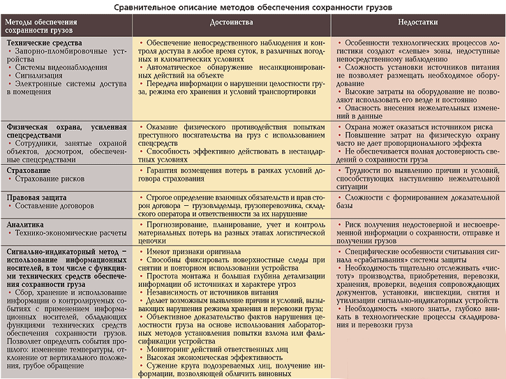 Результатом постоянной борьбы «снаряда» (злоумышленник, халатный сотрудник) и «брони» (система защиты) становится нахождение оптимального уровня и метода обеспечения безопасности грузов. К традиционным методам защиты грузов относятся использование технических средств, физическая охрана, страхование, правовая защита, управленческие методы. Их краткое описание, а также основные достоинства и недостатки приведены в таблице. Расслабился, не думаешь о «броне» – найдется «снаряд», который ее пробьет. Но если сделаешь броню слишком толстой, а снаряд, который бы ее пробил, еще не изобретен, потратишь впустую кучу денег, которые можно было бы употребить с большей пользой.