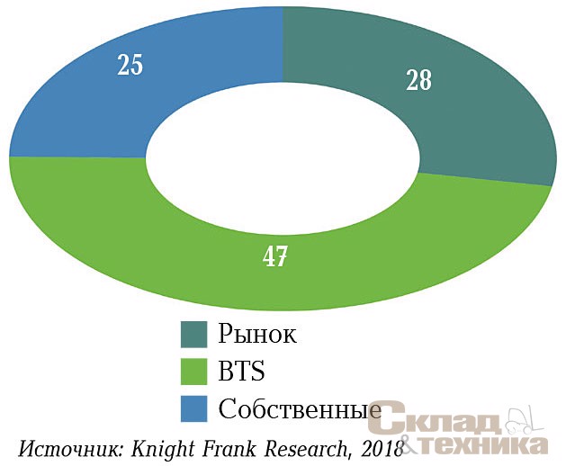 В Московском регионе по предварительным итогам 2018 г. введено в эксплуатацию около 850 тыс. м2 качественных складских площадей, что на 49% выше аналогичного показателя 2017 г. При этом около 72% общего объема введенных в эксплуатацию в 2018 г. складских площадей построены под заказ или с привлечением генерального подрядчика, остальные 28% – для дальнейшей сдачи в аренду.