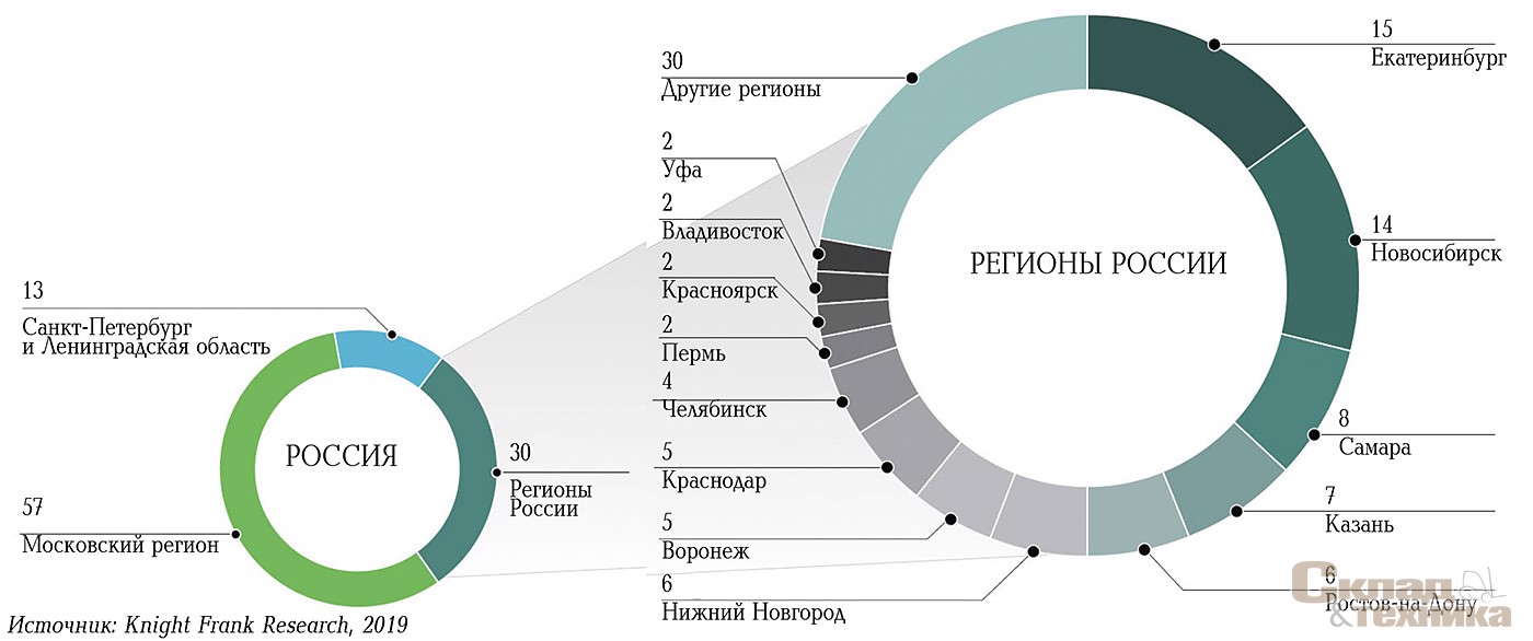 «Региональный рынок складской недвижимости* в 2018 г. не демонстрировал существенного роста и развития. Основной объем нового строительства приходился на проекты, реализуемые под заказчика, а основными потребителями складской недвижимости в регионах России остаются операторы розничной торговли, которые развиваются как в городах-миллионниках, так и в городах с населением 250–500 тыс. чел. Однако в 2019 г. ожидается выход на региональный рынок складской недвижимости большого объема спекулятивных объектов, которые сейчас строятся в таких городах как Екатеринбург, Новосибирск, Ростов-на-Дону и др.» – отмечает директор департамента индустриальной, складской недвижимости, земли, Knight Frank, Россия и СНГ Сергей Кузичев.