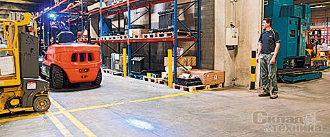Сигнальные огни синего цвета. С помощью красного или синего светового пятна на полу перед вилочным погрузчиком или позади него каждый сотрудник может понять, что машина приближается, даже если она находится не в зоне прямой видимости, например, за углом. Синее пятно света дает фонарь, который можно легко установить на верхней части машины.