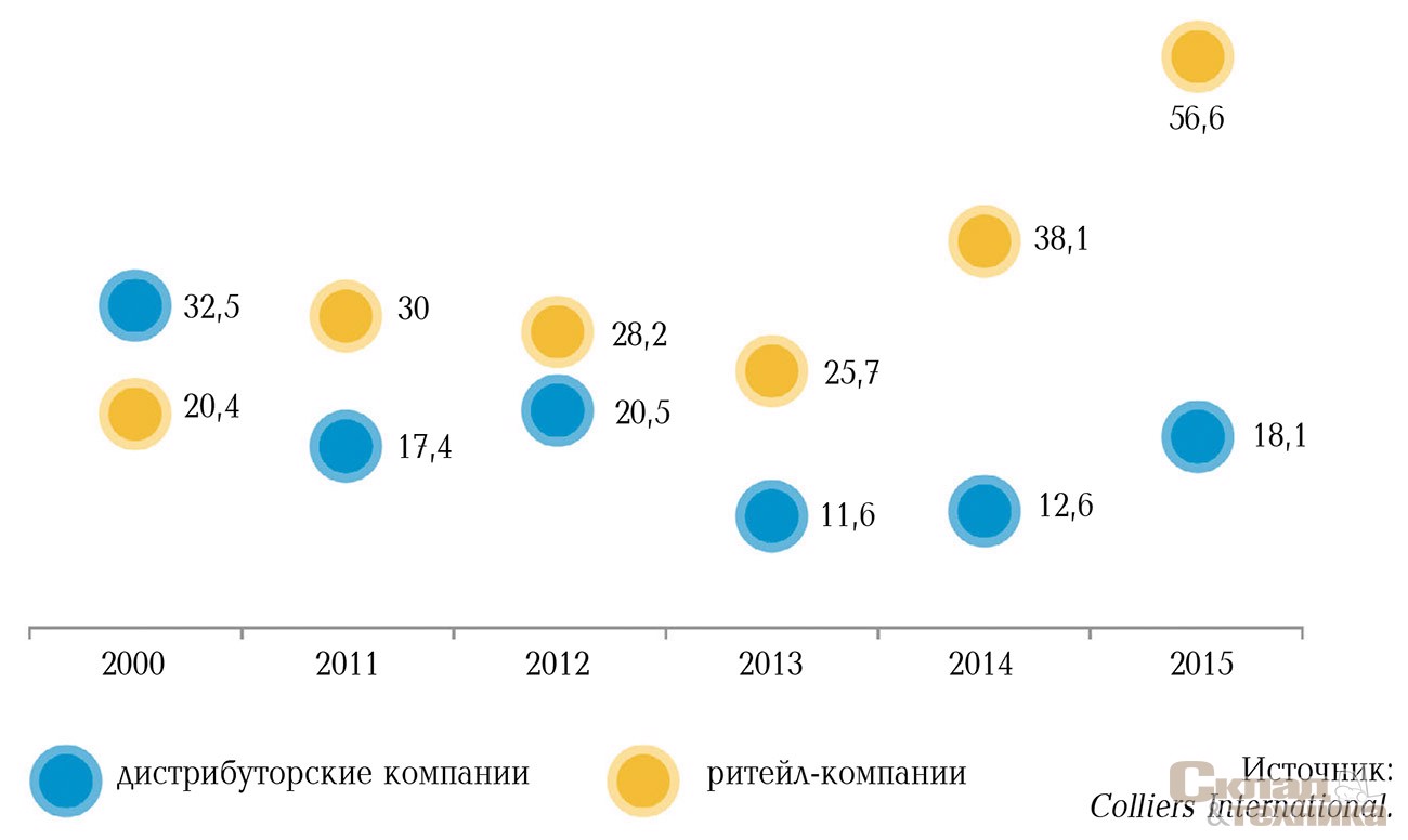 Наибольшую активность на рынке складских площадей с начала 2015 г. в России показывают крупные торговые компании. Их доля за январь–август 2015 г. составила около 74,7% от общего объема сделок (из них ритейлеры – 56,6%, дистрибуторы – около 18,1%) против 43,2% от общего объема сделок с торговыми компаниями за соответствующий период предыдущего года. Доля торговых компаний в Московском регионе – 71,5% (ритейлеры – 52,5%, дистрибуторские – около 19,0%). Помимо этого более 47,2% площадей, арендованных и приобретенных торговыми компаниями в России, были заняты ведущими продуктовыми операторами – «Дикси», X5 Retail Group, Globus Group – в Москве данный показатель составил порядка 44,4%.